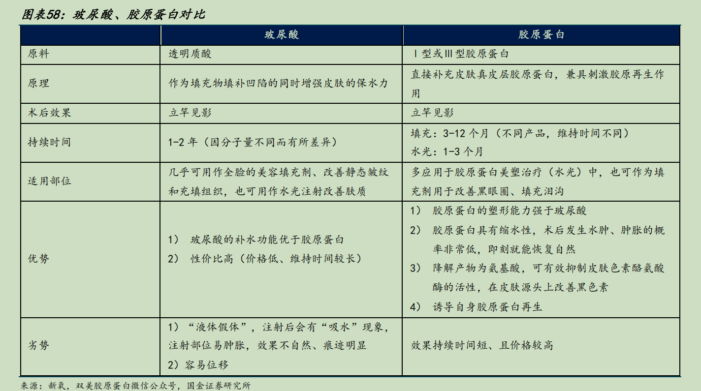 国金证券研报《重组胶原蛋白龙头,护肤业务高速增长、医美第二增长曲线可期》指出,玻尿酸与胶原蛋白互有优势。玻尿酸的优势包括补水功能优于胶原蛋白、性价比高(价格低、维持时间较长),而胶原蛋白的优势在于塑形能力强于玻尿酸等,并同样列举了两类产品的各自劣势。